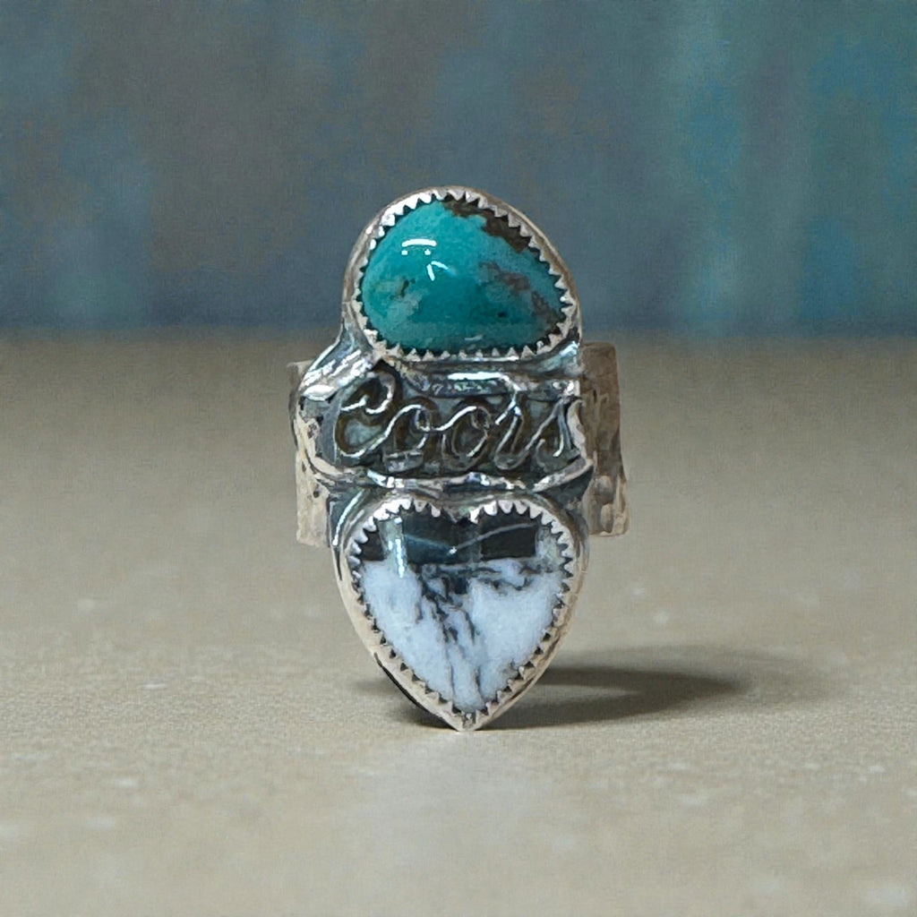 Sterling Silver adjustable Ring-Nevada Turquoise & White Buffalo Turquoise, vintage Coors (1970s).