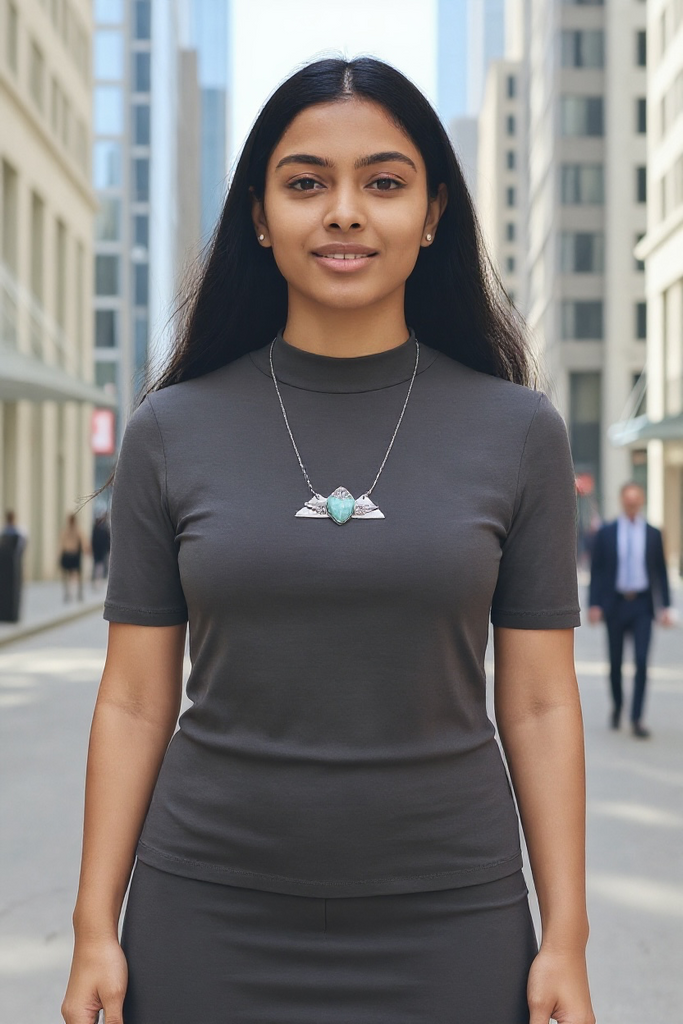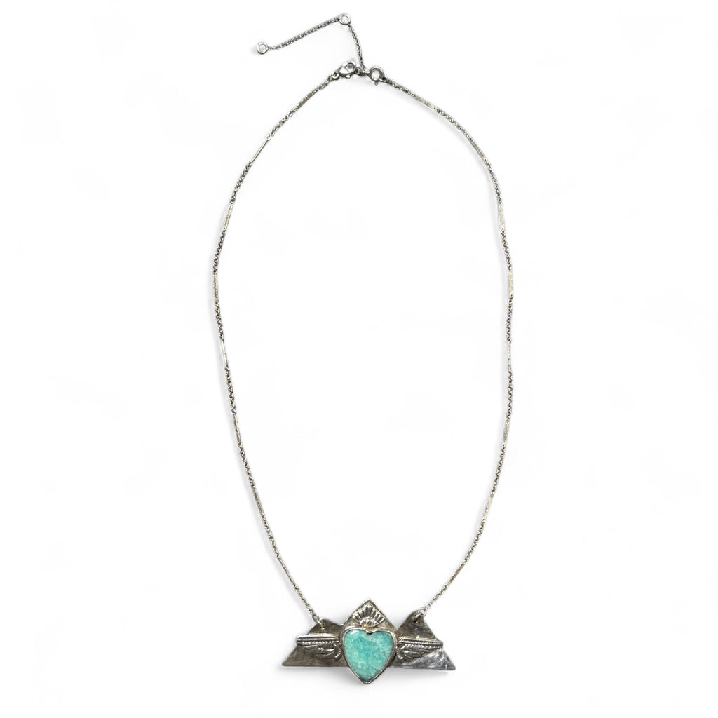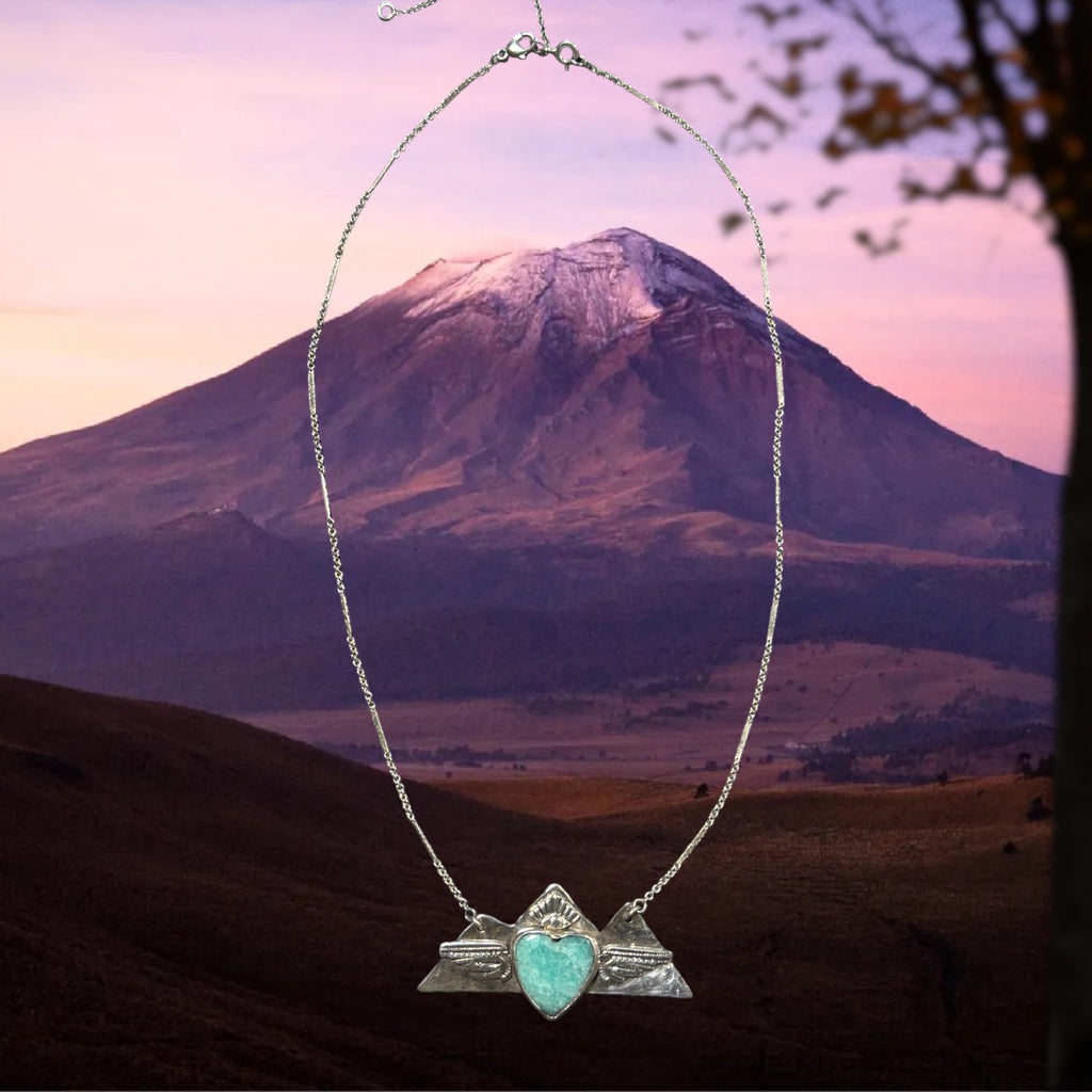 Handmade sterling silver mountain pendant necklace featuring a heart-shaped Amazonite center. The soothing blue-green Amazonite symbolizes harmony and courage, making this the perfect nature-inspired accessory for mountain lovers and free spirits.