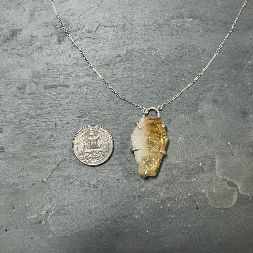 Handmade by Mandalynn Jewelry Designs, this striking citrine coffin-shaped pendant is set in sterling silver and hangs on an adjustable 16–18 inch chain — a bold, elegant statement piece.
