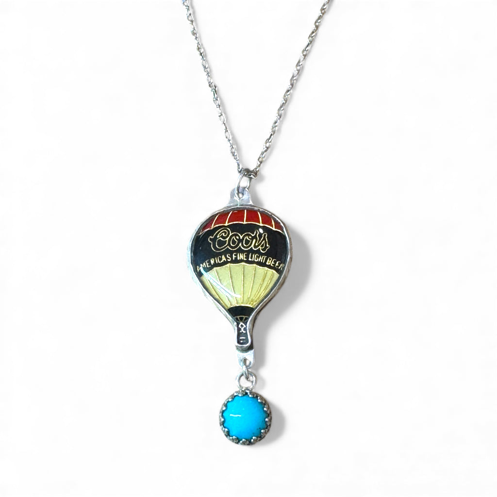Sterling Silver hot air balloon with dangling Turquoise stone. Chain measures 16-18 inches.