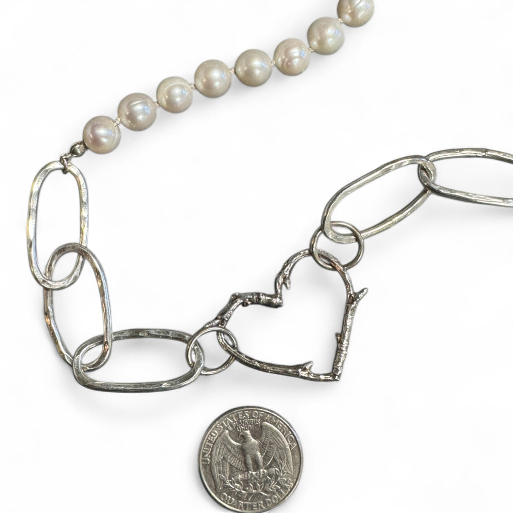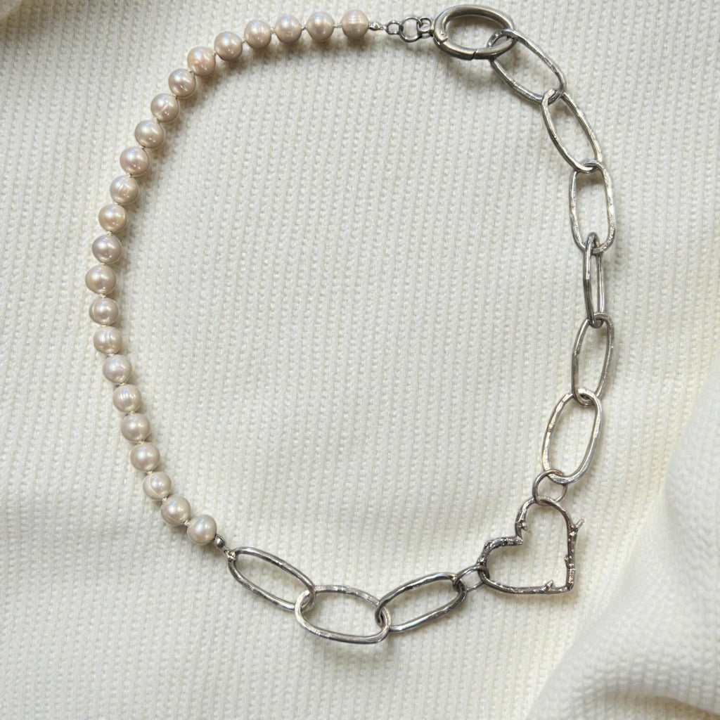 This handmade sterling silver necklace by Mandalynn Jewelry Designs showcases hand-knotted natural white freshwater pearls on a textured silver heart chain. Beautifully versatile, it can be styled multiple ways — with the heart in the center or to the side. Perfect for pearl lovers, bridal wear, or everyday elegance.