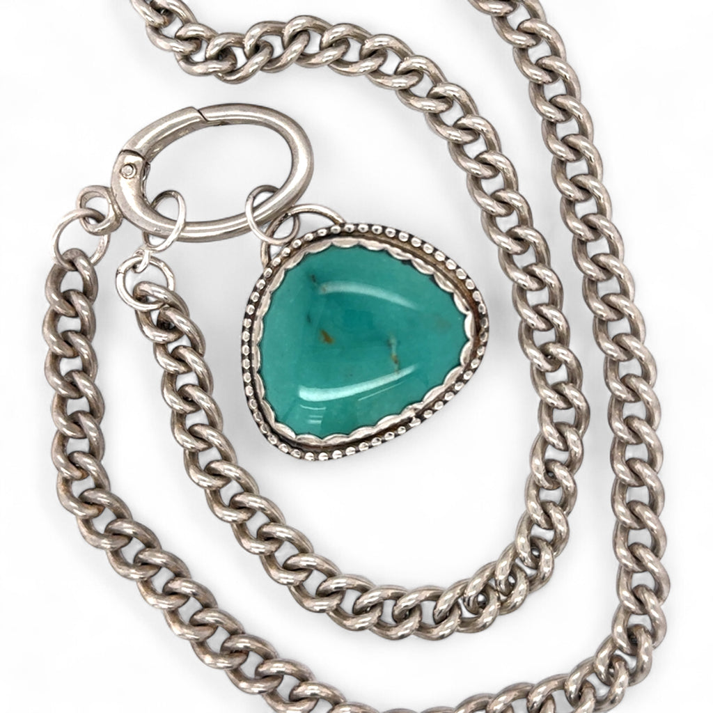 Handmade by Mandalynn Jewelry Designs, this one-of-a-kind piece features rare Nila Turquoise from a small mine in western Nevada. The vibrant, all-natural turquoise is set in sterling silver and paired with a bold, heavy curb chain that can be worn alone or with interchangeable pendants. A true statement necklace that celebrates the beauty of American-mined turquoise and exceptional craftsmanship.