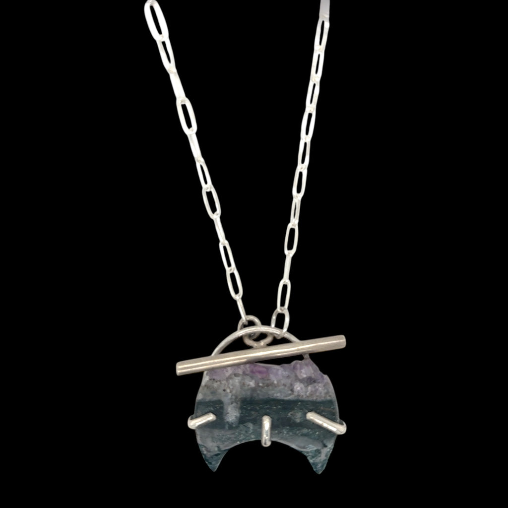 Handmade by Mandalynn Jewelry Designs, this sterling silver necklace showcases a striking amethyst that resembles vampire teeth — a truly unique gemstone with bold spooky vibes and year-round allure.