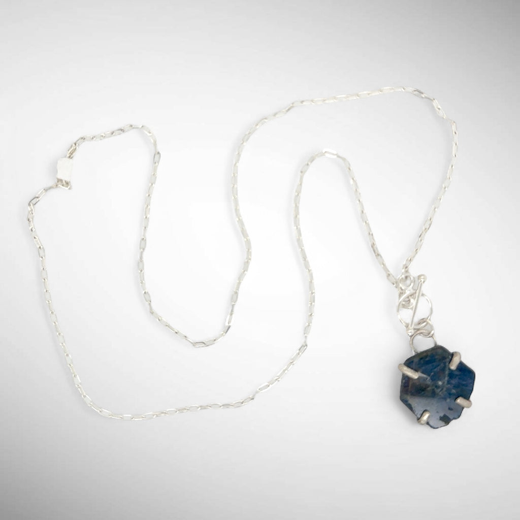 A little slice of Sapphire set in Sterling Silver, handmade by Mandalynn Jewelry Designs. Clasp, toggle in front.